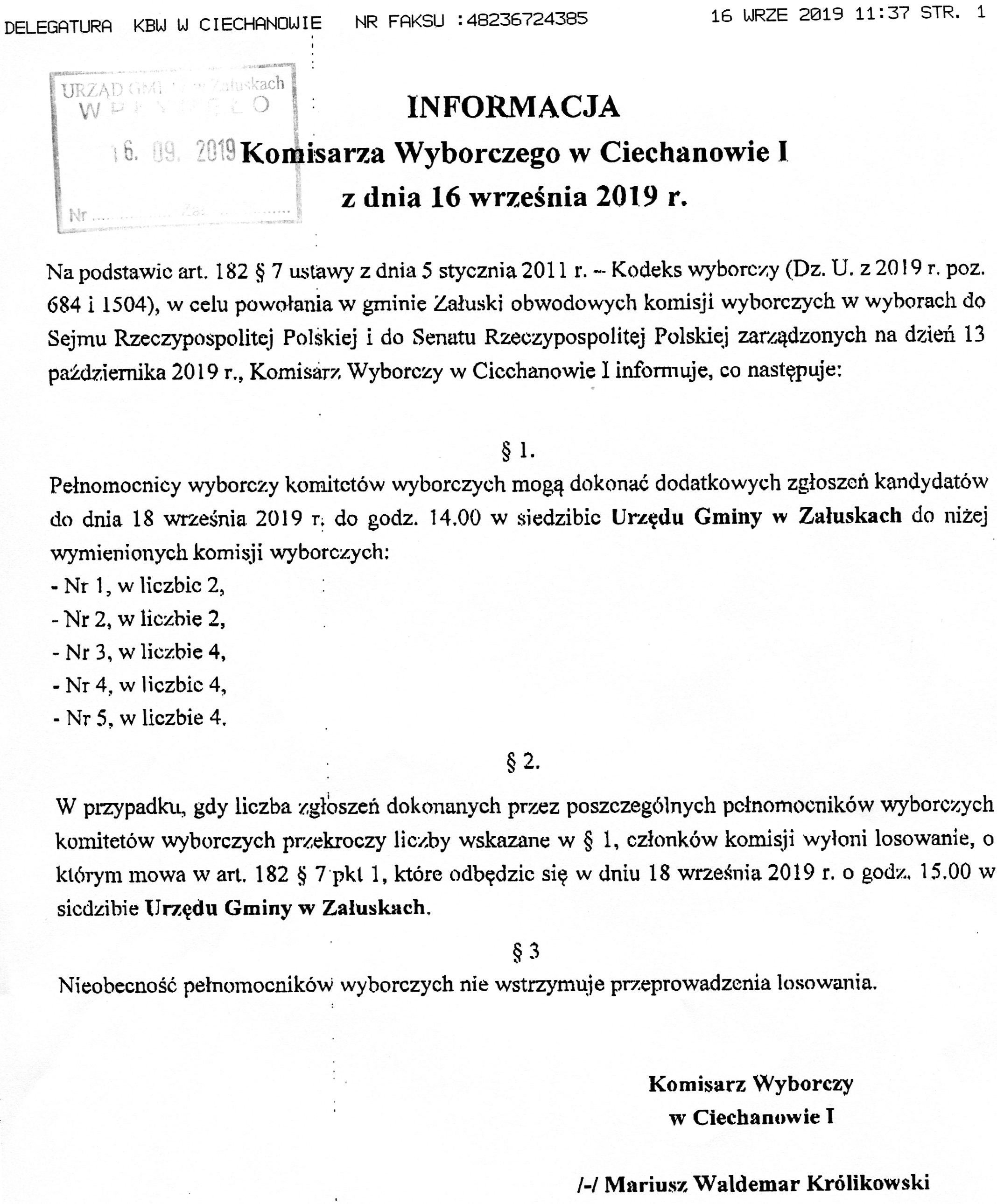 Drukuj Informacja Komisarza Wyborczego