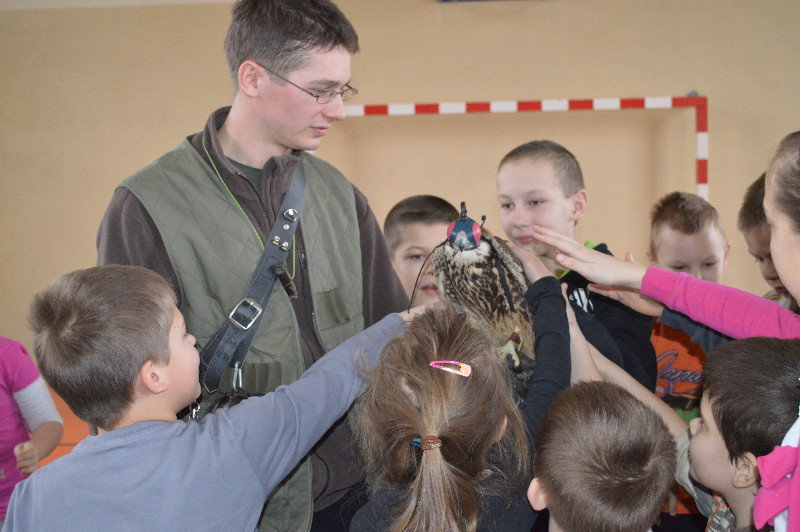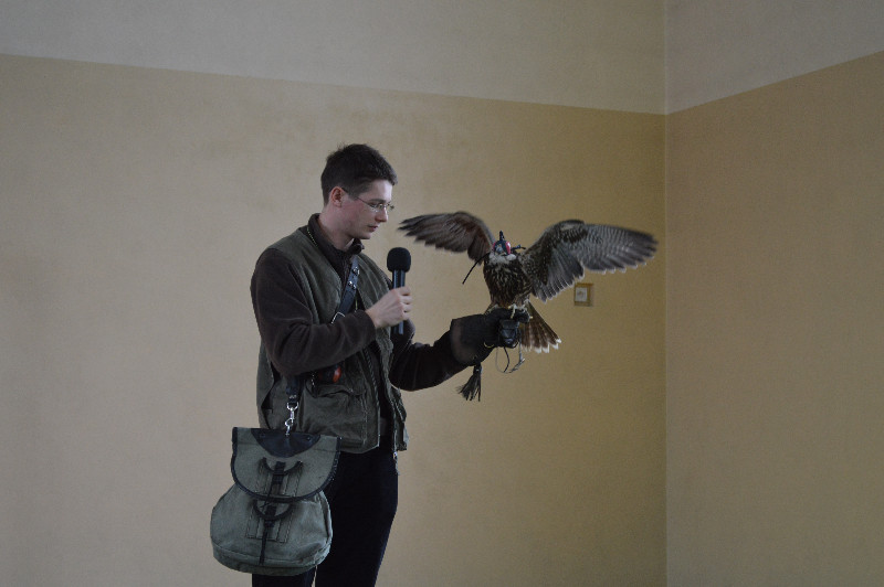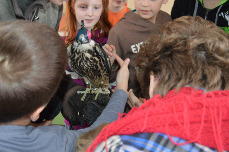 Bohaterami spotkania byli sokół i jego treser – Grzegorz Paluchowski, który przybliżył gościom nie tylko bardzo ciekawą historię sokolnictwa w Polsce, ale także zdradził sekrety oswajania i tresury tych pięknych ptaków. Największą atrakcją dla najmłodszych uczestników spotkania była możliwość pogłaskania sokoła. Pan Grzegorz Paluchowski opowiadał również o swojej pracy na pobliskim lotnisku w Modlinie i o współczesnym wykorzystaniu sokołów.