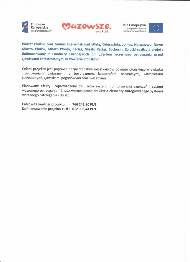 Gmina Załuski, wspólnie z gminami: Czerwińsk nad Wisłą, Dzierzążnia, Joniec, Naruszewo, Nowe Miasto, Płońsk, Miasto Płońsk, Raciąż, Miasto Raciąż i Sochocin,realizuje projekt dofinansowany z Funduszy Europejskich pn. „System wczesnego ostrzegania przed zjawiskami katastrofalnymi w Powiecie Płońskim”.
