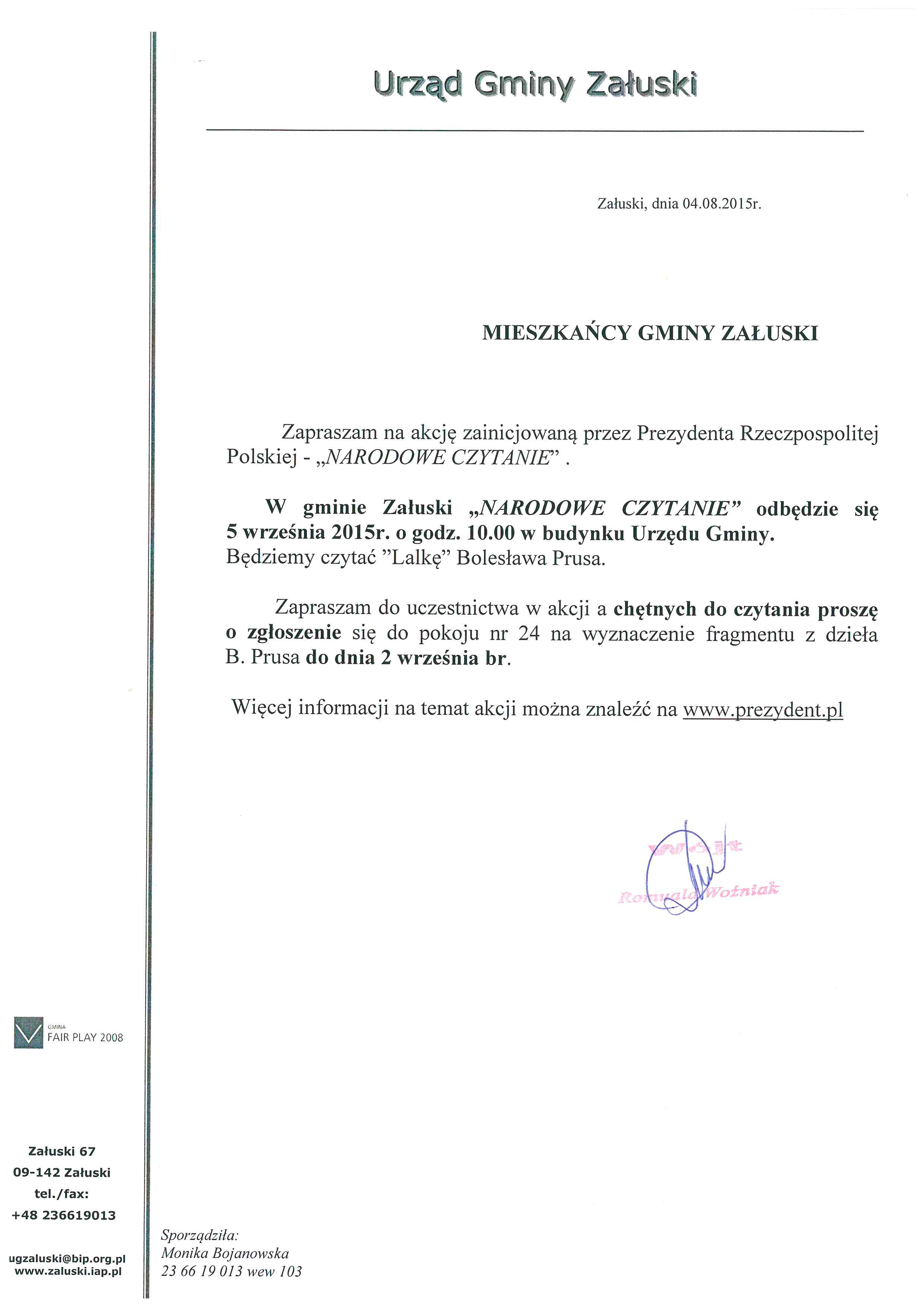 Zapraszamy na akcję zainicjowaną przez Prezydenta Rzeczypospolitej Polskiej "NARODOWE CZYTANIE"